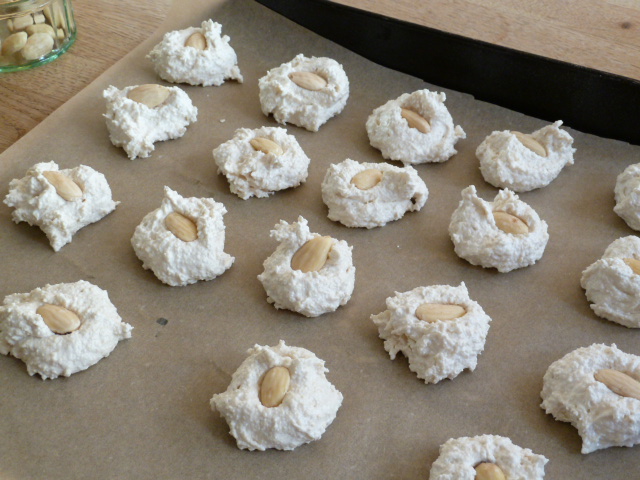 - Spoon the mixture onto the prepared baking tray and pop a blanched almond on top