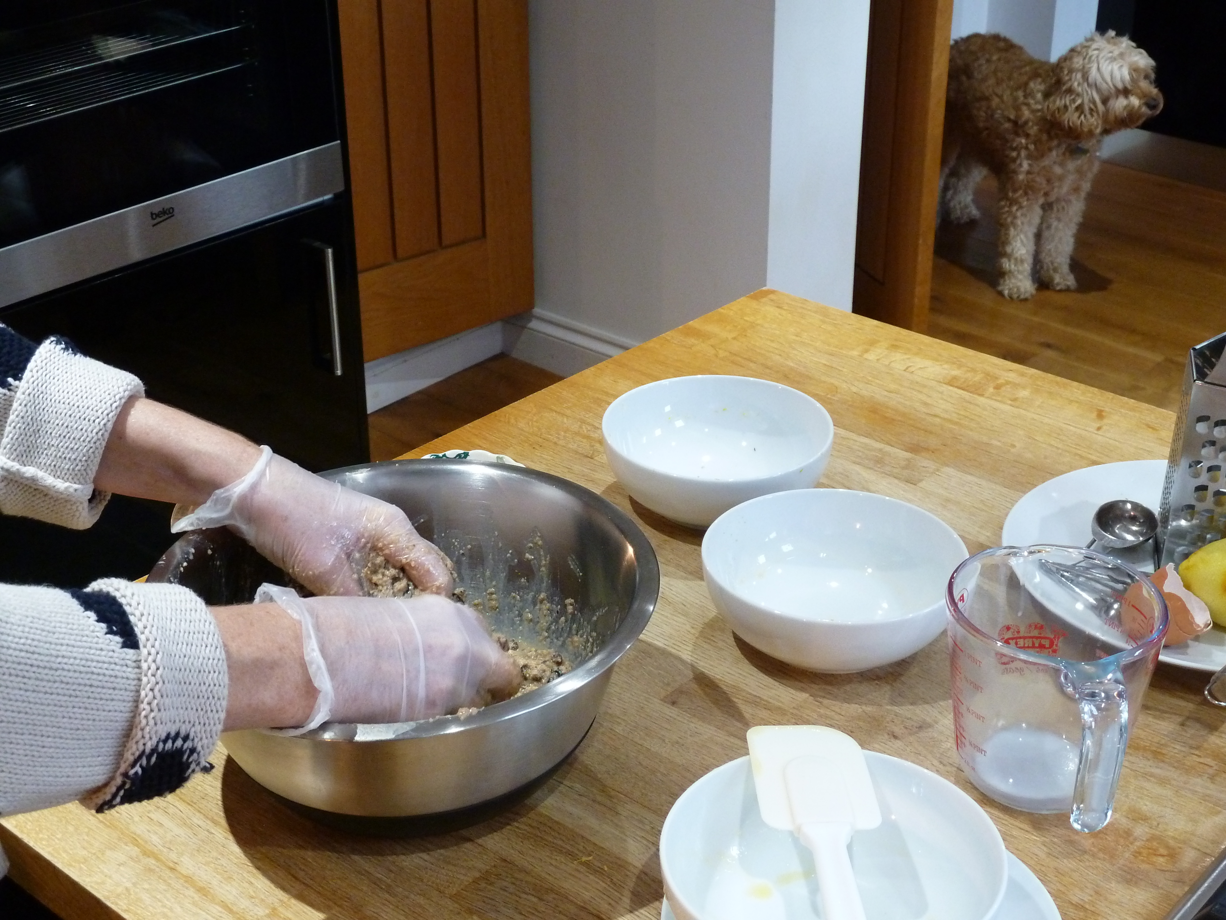 - crumble the bread into a large mixing bowl ( as you can see I has an audience today, my Alfie came in to see what all the fuss was about)