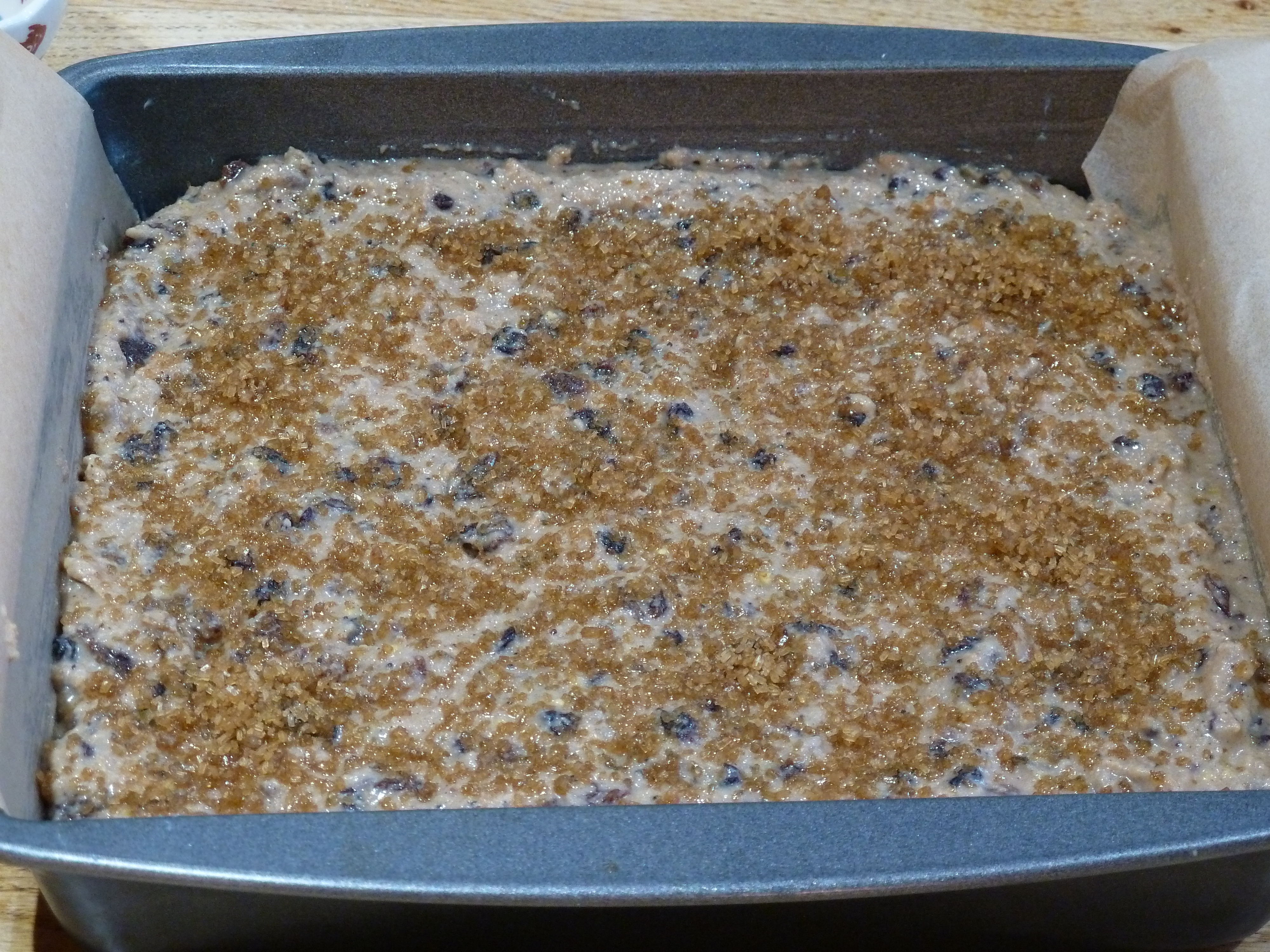 - when ready spoon the bready mixture into the prepared tin and sprinkle some demerara sugar on top