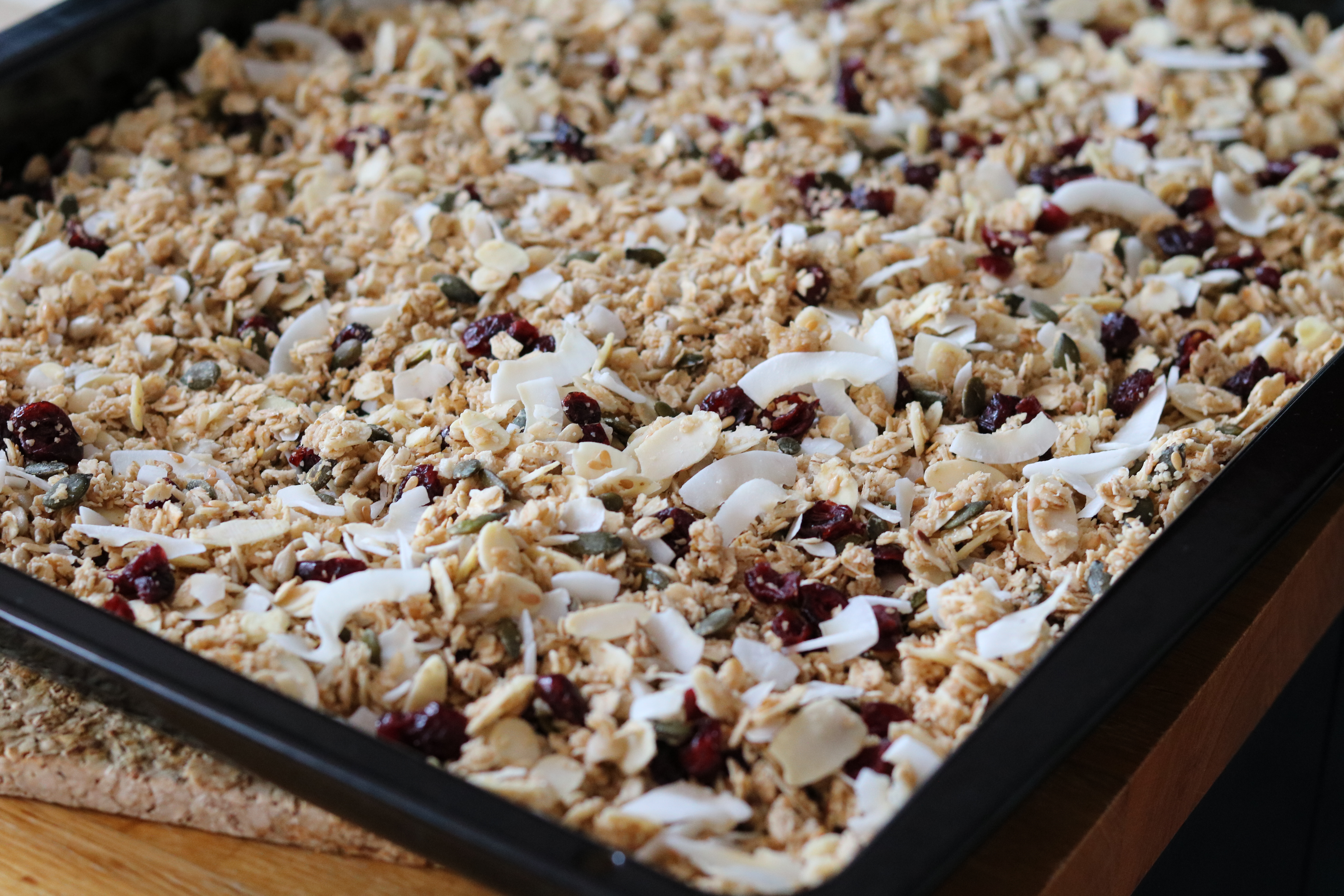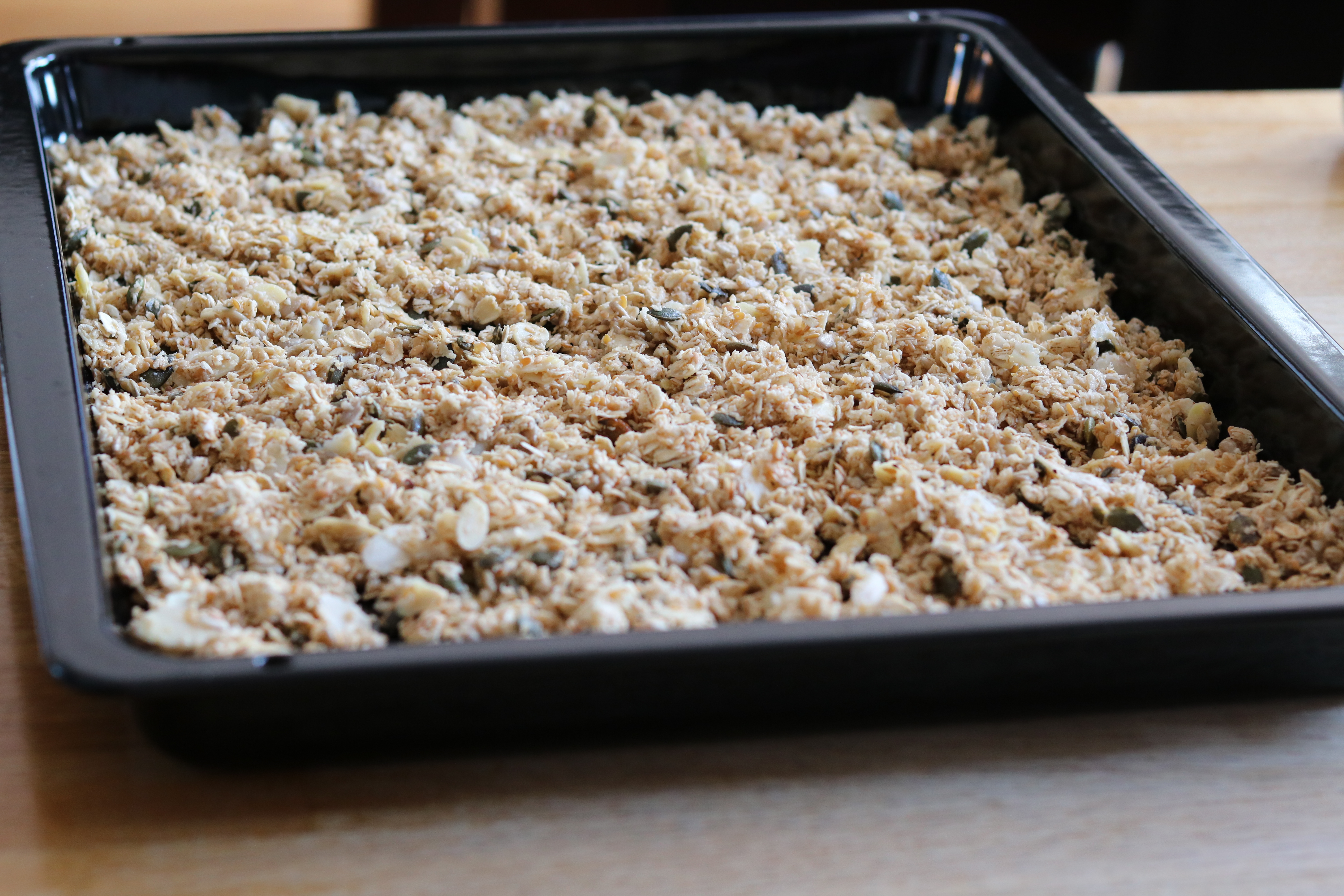 Tip the granola onto your baking sheet(s) and spread evenly, bake for 20 minutes, give it a stir and a mix around after ten minutes so that it will cook evenly.
