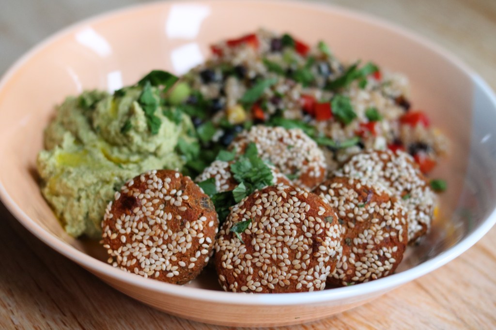 I’ve made the falafels before and decided to sprout the chickpeas, which makes them easier to digest and increases their nutritional value. Quinoa tabbouleh is a great accompaniment to the falafels and is also high in protein, especially by adding black beans. The lemon coriander hummus finishes the dish by adding another texture and even more protein.