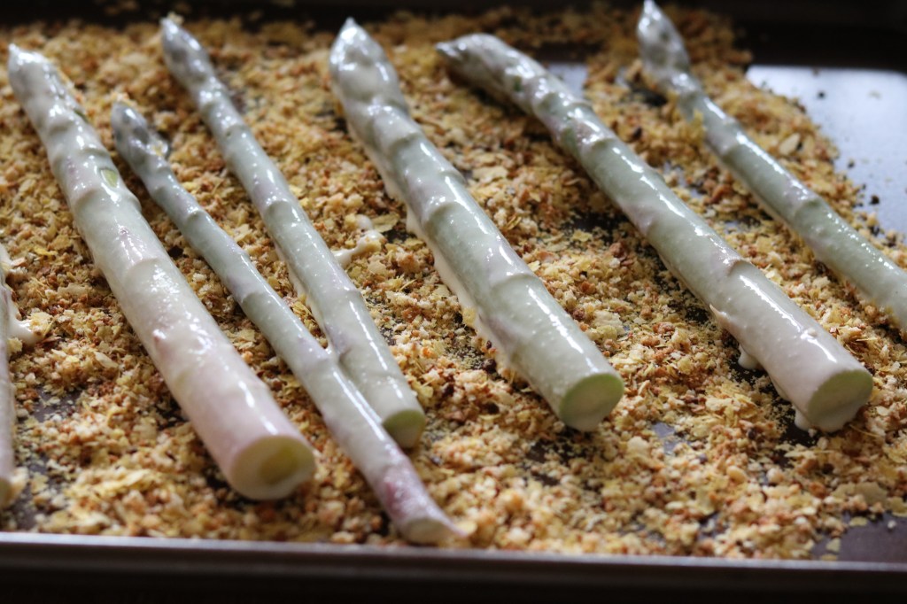 - In another bowl, mix together the breadcrumbs and nutritional yeast and put on a flat plate or tray, this will make it easier to roll the asparagus in the mixture.