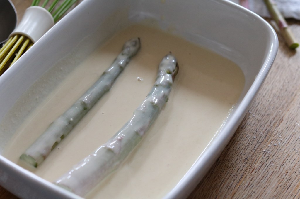 - Make the batter – add the batter ingredients to a bowl and whisk together, put in a oblong dish, this makes it easier to coat the asparagus.