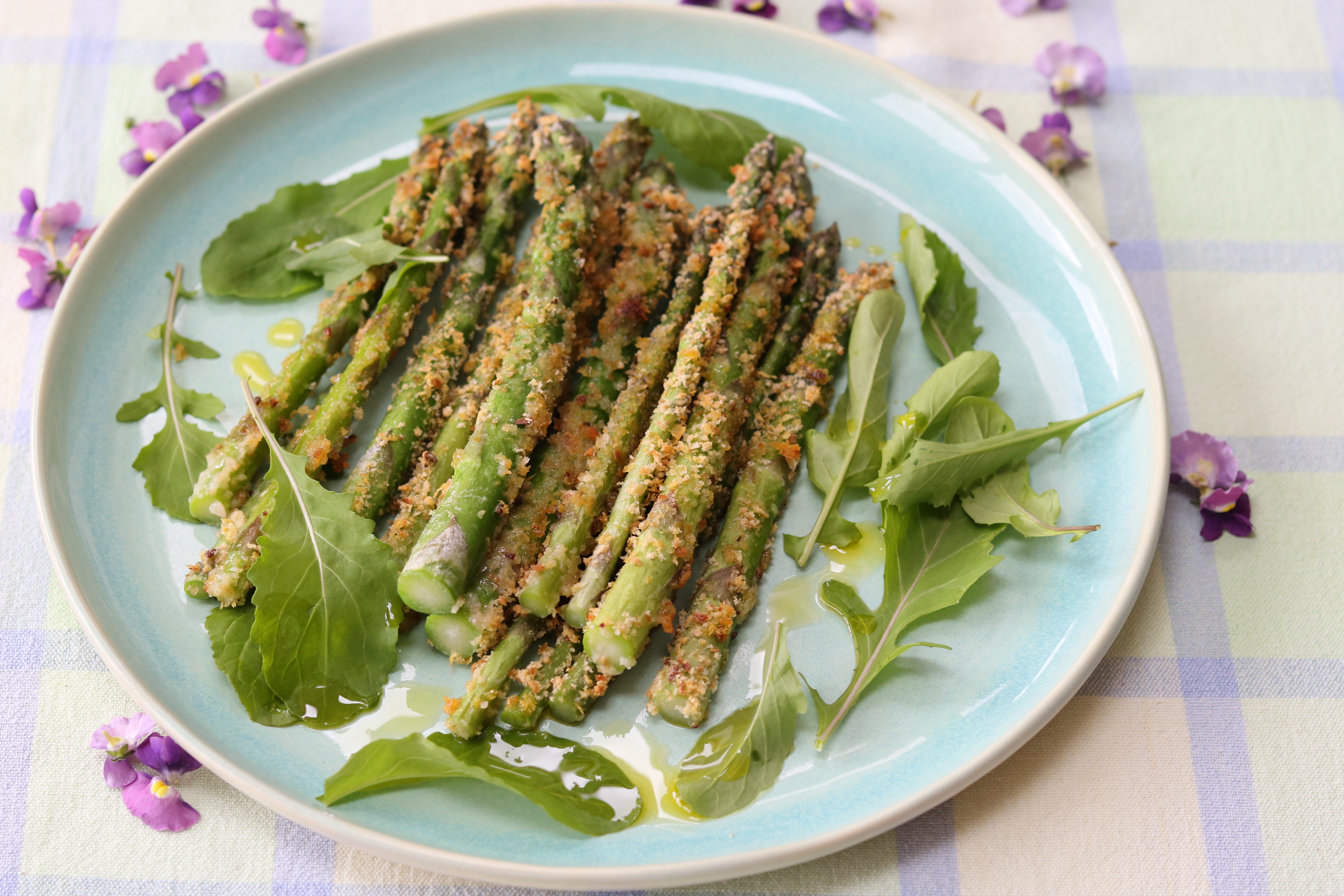 Asparagus doesn’t need much prepping and cooking. Just bend the stalk and it should snap off where it is woody and give them a good wash. I do mine in my steamer for as little as 5 minutes, less if they are thin ones and in a stir fry I slice on the slant and add them towards the end and stir fry for only a couple of minutes. To roast, I toss in olive oil and season with freshly milled sea salt and black pepper, place them on a baking tray and cook in a very hot oven (200/220 degrees) for no more than 5 minutes. My favourite way of eating them is crispy baked. I discovered this when I had some batter and bread crumbs left after I had made some ‘tofish’ fingers. I simply dipped them in the batter then tossed them in the breadcrumbs, put them on a baking tray, drizzed with olive oil and baked in a hot oven for 5 minutes. I just recently made them again and this time I added some nutritional yeast to the breadcrumbs, they were delicious.
