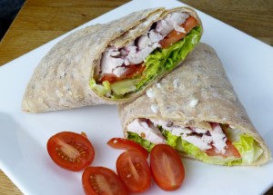 GF Newburn Bakehouse seedy wrap with a spreading of mayo, shredded baby gen lettuce, sliced baby plumb tomatoes, sliced roasted chicken and a spoonful of cranberry sauce